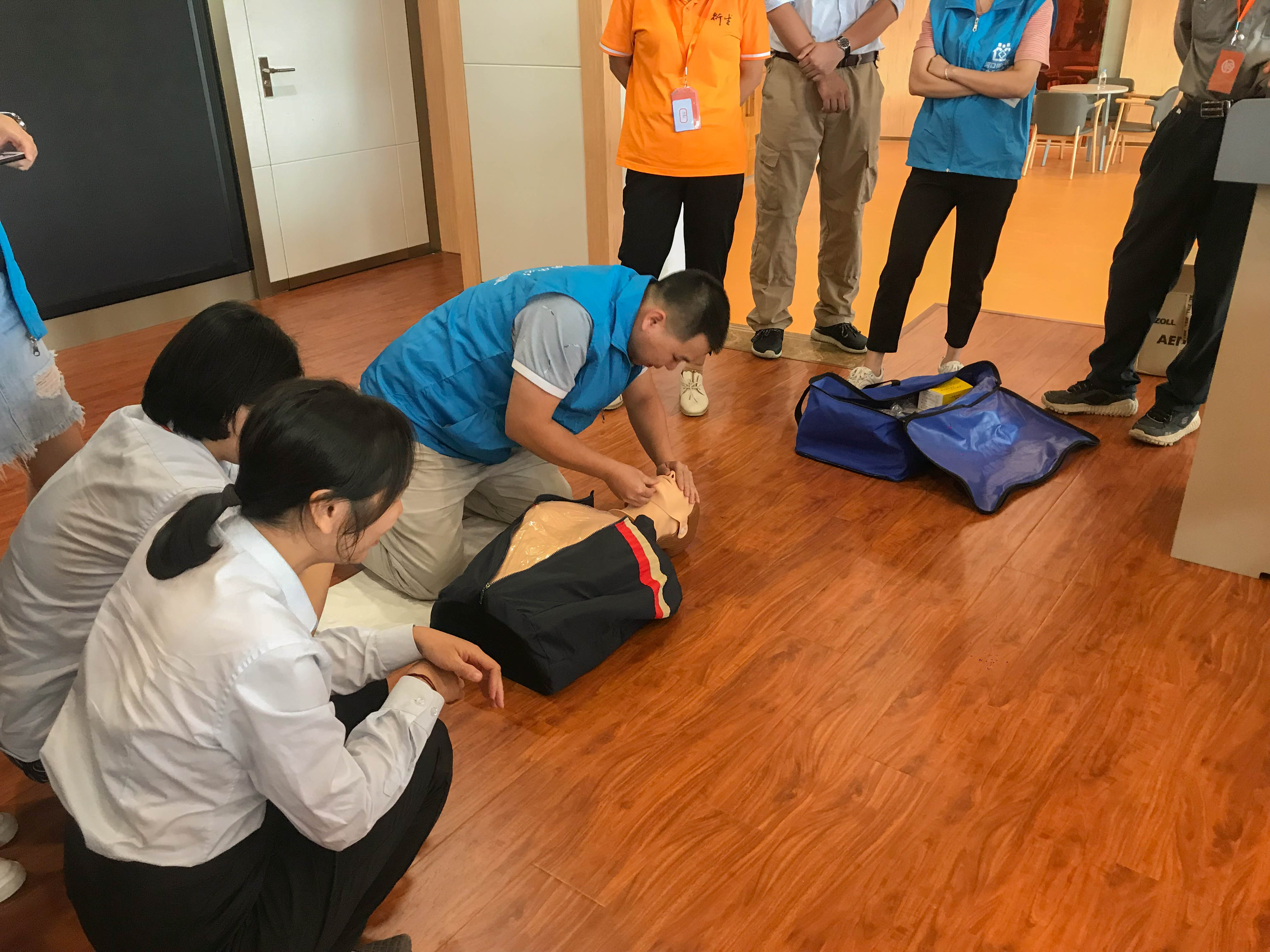 衛(wèi)生院專業(yè)人士以先理論、后實(shí)操的方式,生動(dòng)形象地向參培人員講解了現(xiàn)場(chǎng)救護(hù)的重要性、中暑急救知識(shí)、創(chuàng)傷現(xiàn)場(chǎng)急救知識(shí),重點(diǎn)講解了如遇需急救人員時(shí)如何正確對(duì)其進(jìn)行心肺復(fù)蘇和胸外按壓,并在現(xiàn)場(chǎng)演示了步驟和姿勢(shì)。