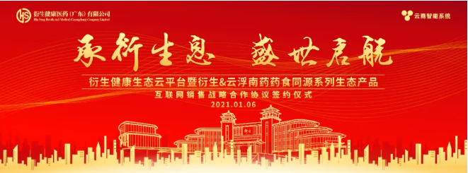 1月6日,衍生健康醫(yī)藥(廣東)有限公司與云商智能系統(tǒng)(廣州)有限公司(源點科技)在衍生健康醫(yī)藥產(chǎn)業(yè)園隆重舉行:衍生健康生態(tài)云平臺暨衍生@云浮南藥藥食同源系列生態(tài)產(chǎn)品互聯(lián)網(wǎng)銷售戰(zhàn)略合作簽約暨啟動儀式 。